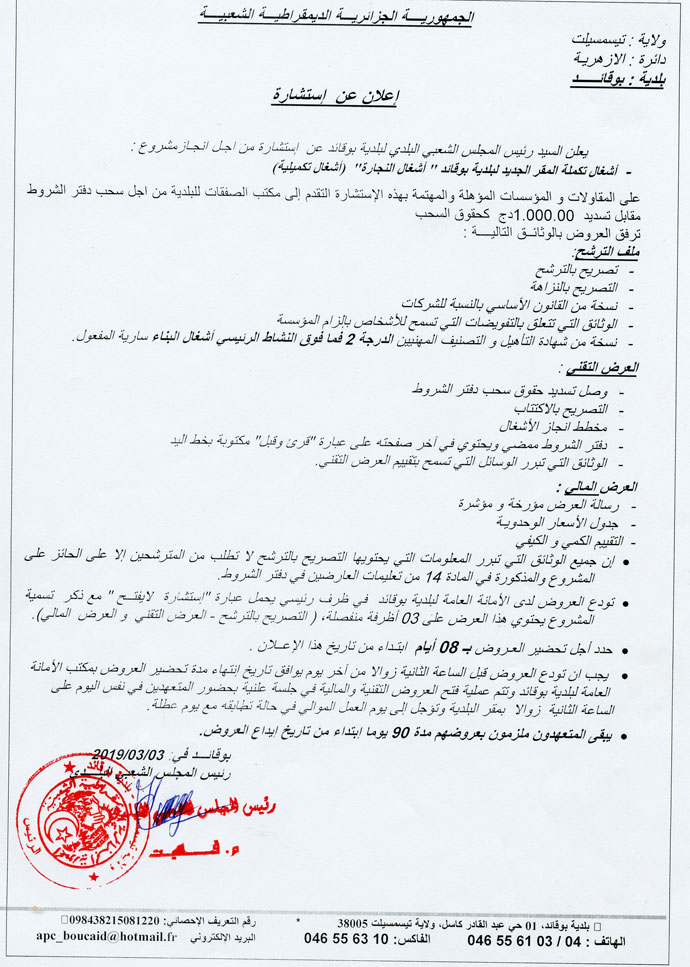 إعلان عن إستشارة بتاريخ 3 مارس 2019