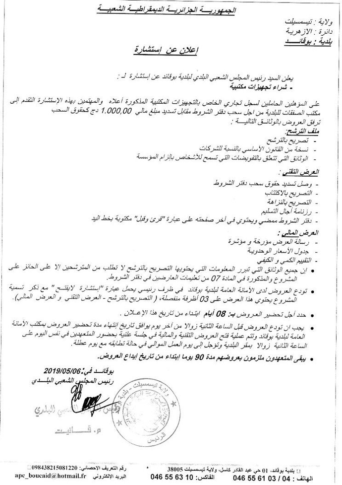 إعلان عن إستشارة بتاريخ 6 ماي 2019