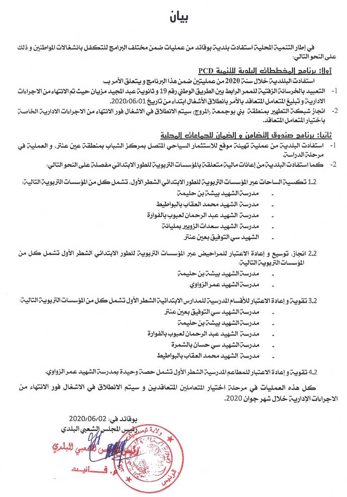 بيان حول وضعية المشاريع التنموية 2020