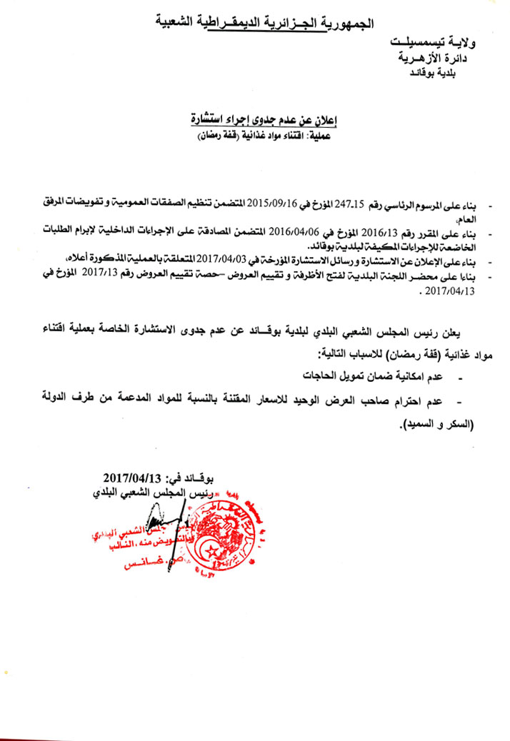 إعلان عن عدم جدوى إجراء استشارة 2017/04/13