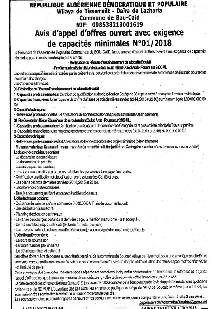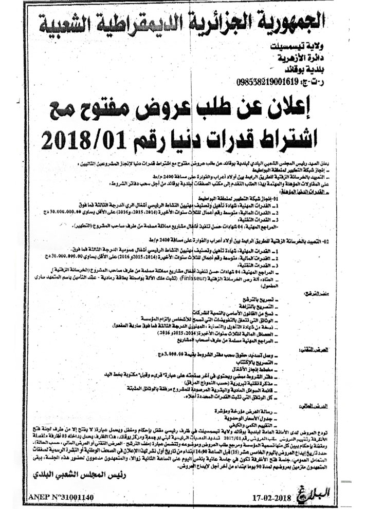إعلان عن طلب عروض مفتوح مع اشتراط قدرات دنيا رقم 2018/01