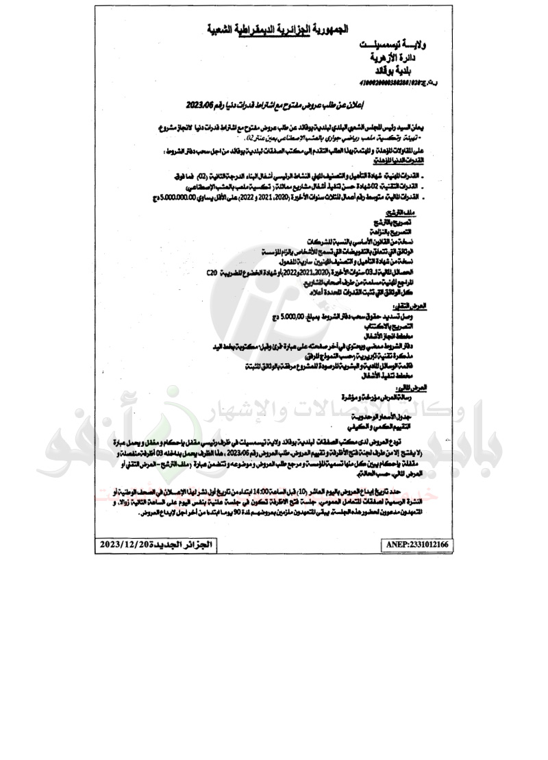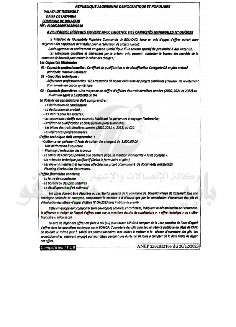 إعلان عن طلب عروض مفتوح مع اشتراط قدرات دنيا رقم : 2023/06