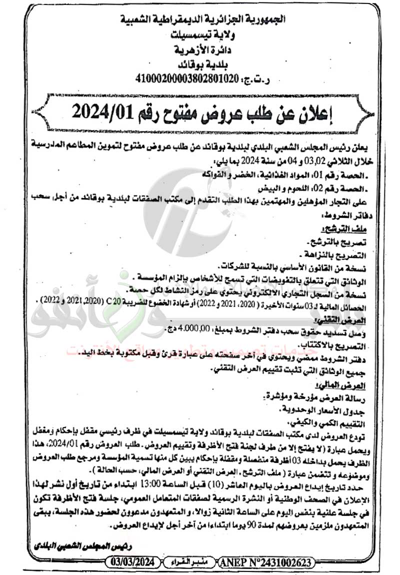 إعلان عن طلب عروض مفتوح رقم 2024/01